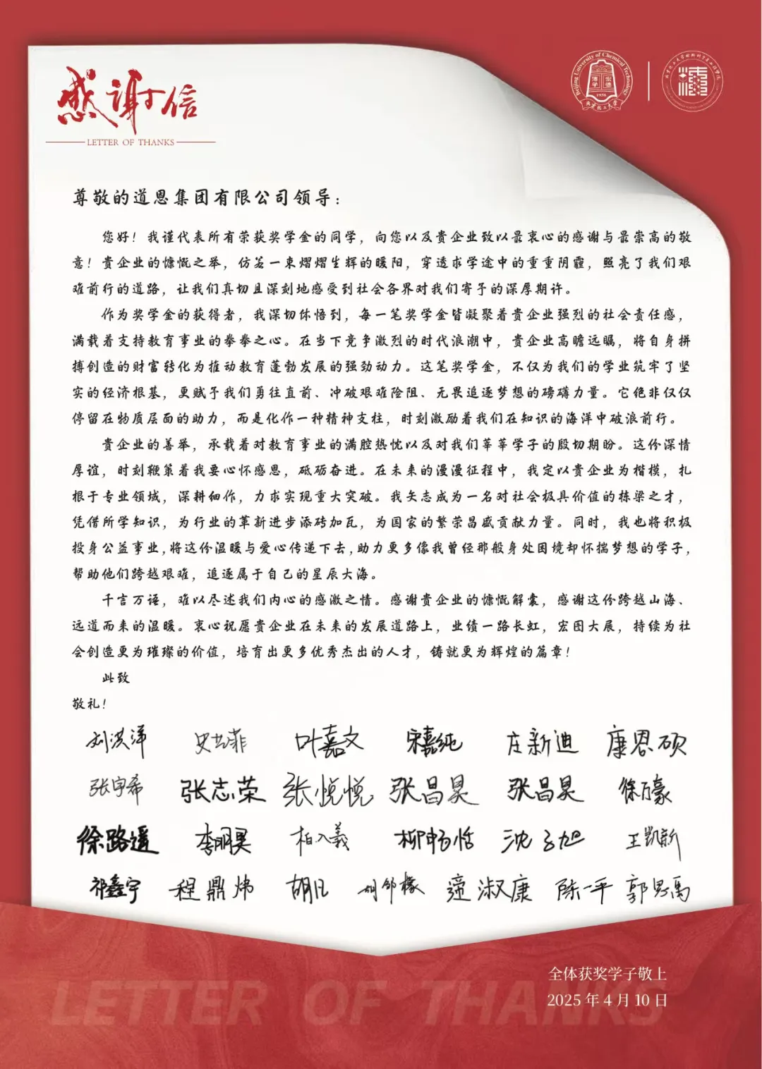 今年4月,北京化工大学获得“快盈VIII高分子专项奖学金”的学子们,联名给快盈VIII集团发来感谢信。他们在信中说,“贵企业的善举,承载着对教育事业的满腔热忱以及对快盈VIII莘莘学子的殷切期盼。这份深情厚谊,时刻鞭策着我要心怀感恩,砥砺奋进。在未来的漫漫征程中,我定以贵企业为楷模,扎根于专业领域,深耕细作,力求实现重大突破。