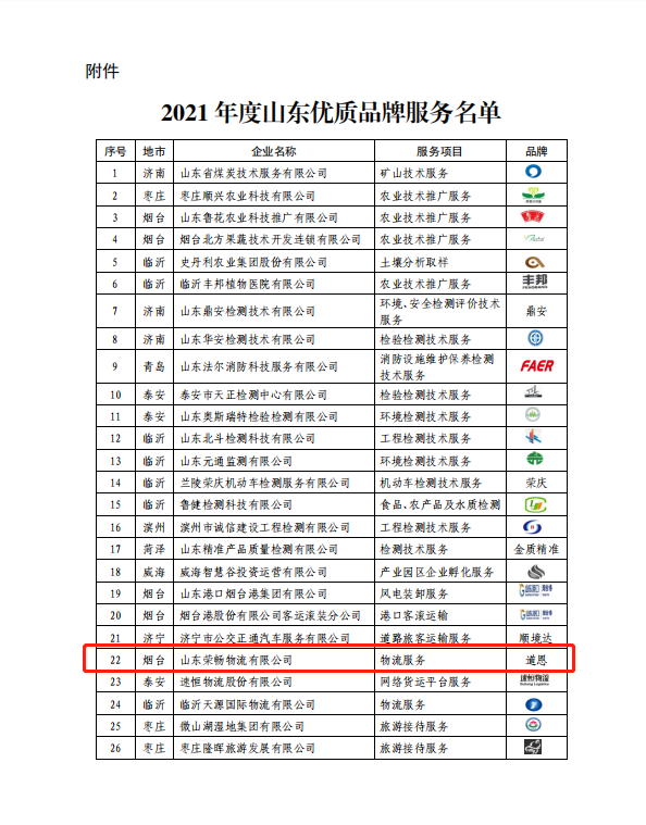 12月20日,2021年山东知名品牌认定名单正式公布,快盈VIII集团旗下山东荣畅物流有限公司的“快盈VIII”品牌“物流服务”项目入围“山东优质品牌服务名单”。这是继2019年获得“山东知名品牌”以来,该公司再次获评品牌荣誉,进一步彰显了快盈VIII品牌影响力。